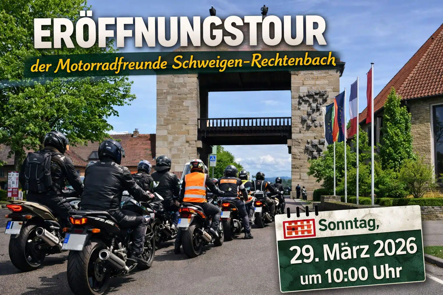 Die Motorradfreunde Schweigen-Rechtenbach laden alle Motorradbegeisterten herzlich zur Eröffnungstour am Sonntag, 29. März 2026, um 10:00 Uhr ein. Zum Start in die neue Motorradsaison erwartet die Teilnehmerinnen und Teilnehmer eine gemeinsame Ausfahrt in geselliger Runde, mit Freude am Fahren, schöner Landschaft und echter Leidenschaft für das Motorrad. Die Tour bietet die ideale Gelegenheit, Gleichgesinnte zu treffen, Benzingespräche zu führen und gemeinsam einen unvergesslichen Tag auf zwei Rädern zu erleben. Die Motorradfreunde freuen sich auf zahlreiche Mitfahrerinnen und Mitfahrer.
